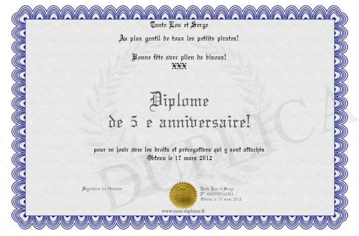 Envoyez par email votre Diplôme de 5 e anniversaire! personalisé