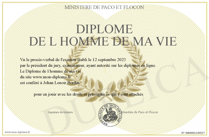 Envoyez par email votre Diplôme de l homme de ma vie personalisé
