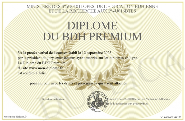 Envoyez par email votre Diplôme du BDH Premium personalisé