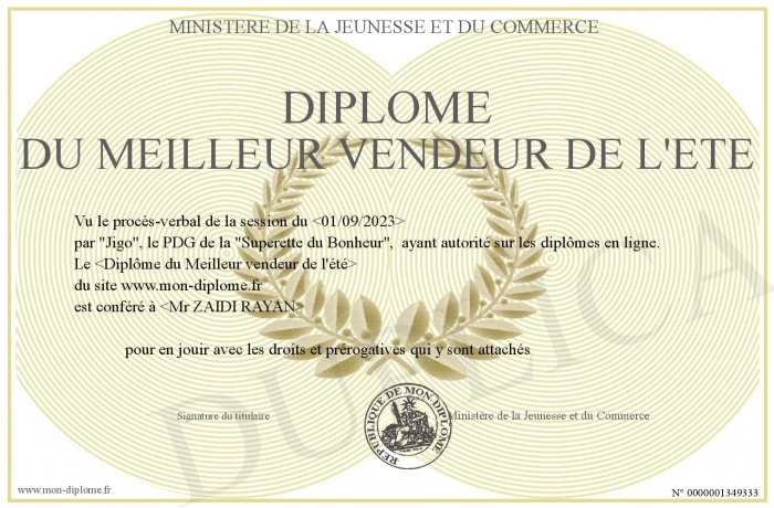 Envoyez par email votre Diplôme du meilleur vendeur de l'été personalisé