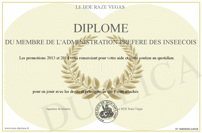 Envoyez par email votre Diplôme du membre de l'administration préféré des Inseecois personalisé