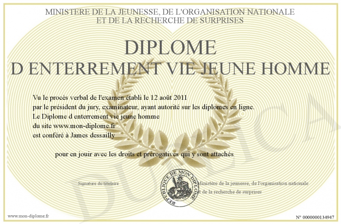 Envoyez par email votre Diplôme d enterrement vie jeune homme personalisé
