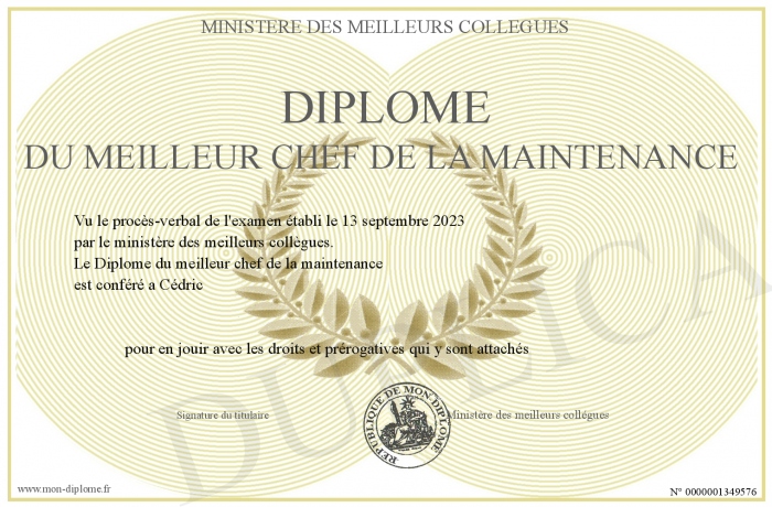 Envoyez par email votre Diplôme du meilleur chef de la maintenance personalisé