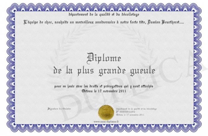 Envoyez par email votre Diplôme de la plus grande gueule personalisé