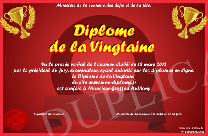 Envoyez par email votre Diplome de la Vingtaine personalisé