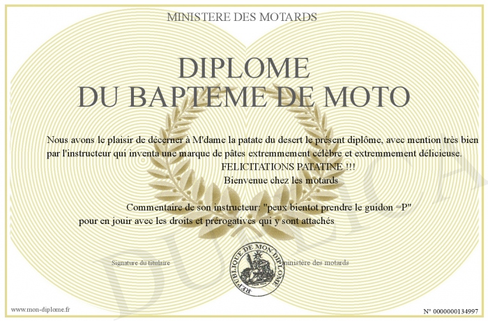 Envoyez par email votre Diplôme du BAPTEME de MOTO personalisé