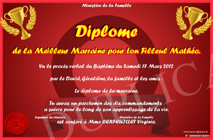 Envoyez par email votre Diplôme de la Meilleur Marraine pour ton Filleul Mathéo. personalisé