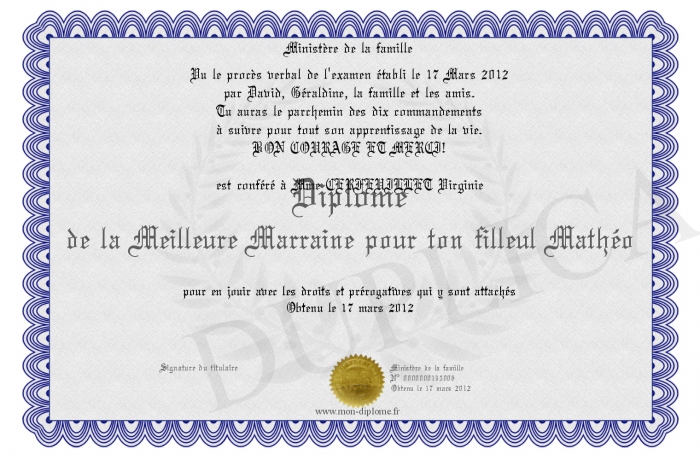Envoyez par email votre Diplôme de la Meilleure Marraine pour ton filleul Mathéo personalisé