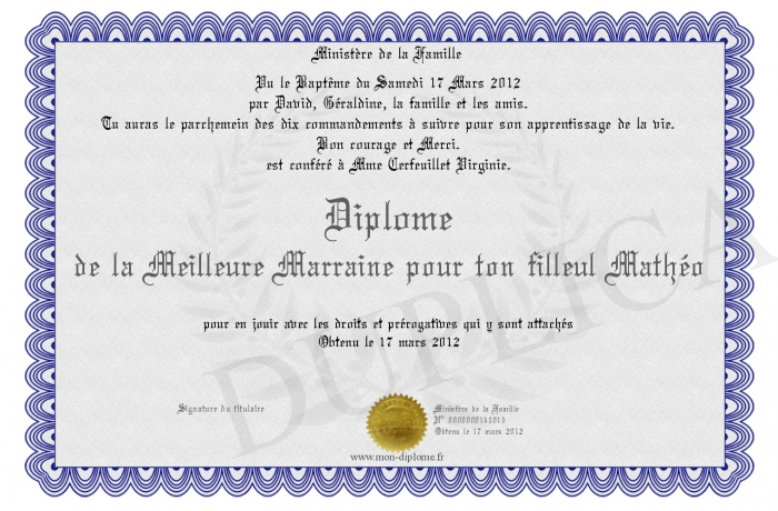 Envoyez par email votre Diplôme de la Meilleure Marraine pour ton filleul Mathéo personalisé