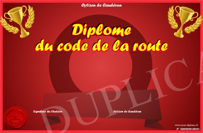Envoyez par email votre Diplôme du code de la route personalisé