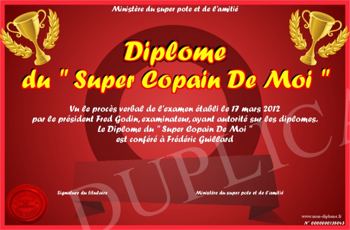 Envoyez par email votre Diplôme du - Super Copain De Moi - personalisé