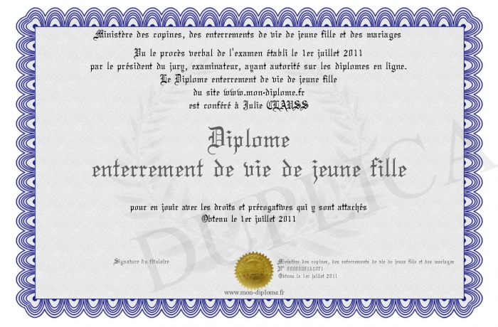 Envoyez par email votre Diplome enterrement de vie de jeune fille personalisé