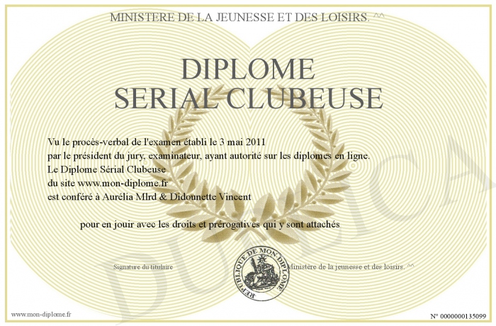 Envoyez par email votre Diplôme Sérial Clubeuse personalisé