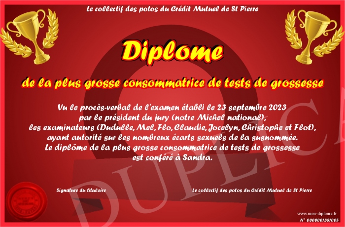 Envoyez par email votre Diplôme de la plus grosse consommatrice de tests de grossesse personalisé