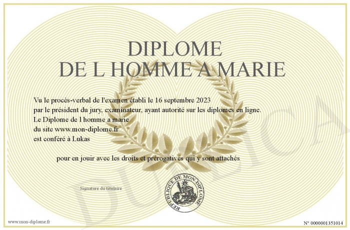 Envoyez par email votre Diplôme de l homme a marie personalisé