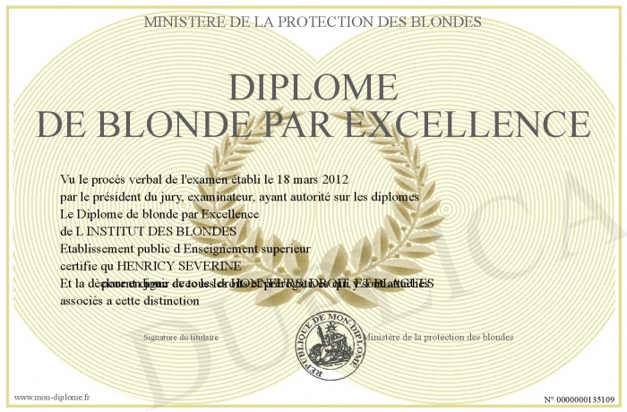 Envoyez par email votre Diplôme de blonde par Excellence personalisé