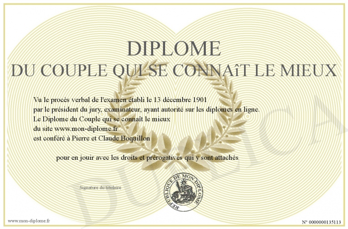 Envoyez par email votre Diplôme du Couple qui se connaît le mieux personalisé
