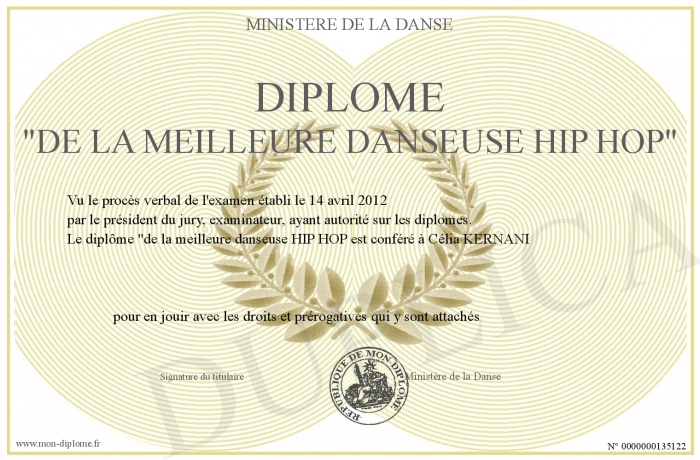 Envoyez par email votre Diplôme -de la meilleure danseuse HIP HOP- personalisé