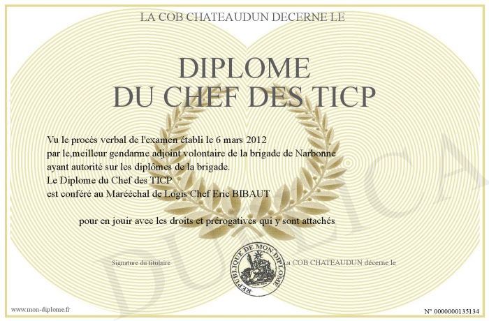 Envoyez par email votre Diplôme du Chef des TICP personalisé