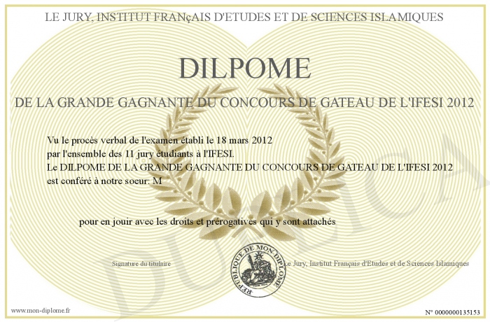 Envoyez par email votre DILPOME DE LA GRANDE GAGNANTE DU CONCOURS DE GATEAU DE L'IFESI 2012 personalisé