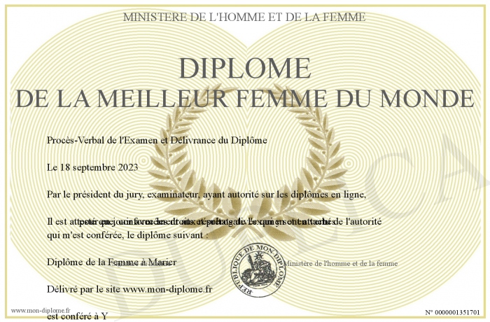 Envoyez par email votre Diplôme de la meilleur femme du monde personalisé