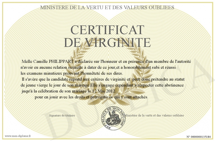 Envoyez par email votre Certificat de virginité personalisé