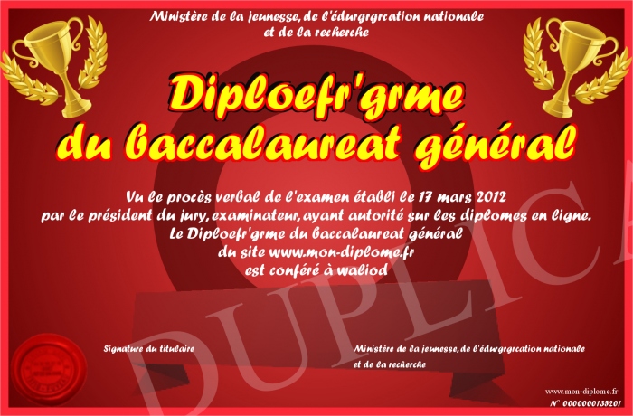 Envoyez par email votre Diplôefr'grme du baccalaureat général personalisé