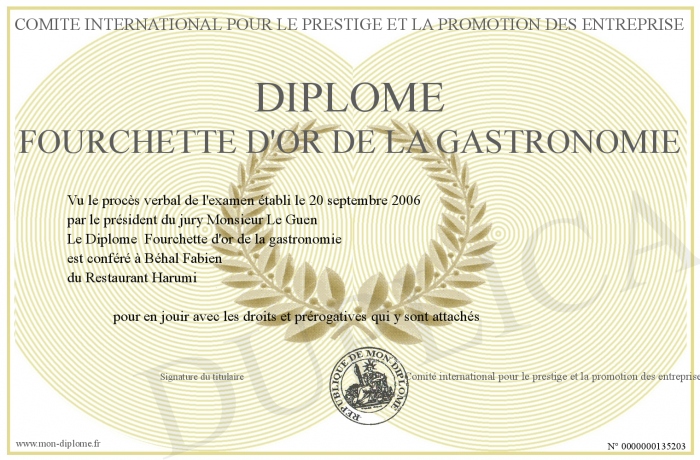 Envoyez par email votre Diplôme Fourchette d'or de la gastronomie personalisé