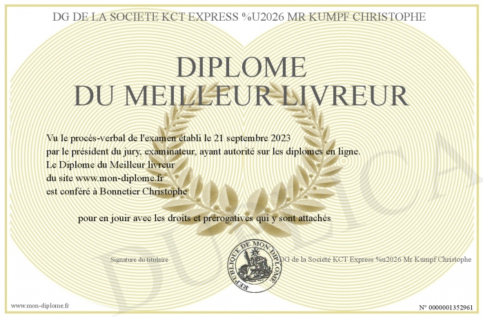 Envoyez par email votre Diplôme du Meilleur livreur personalisé