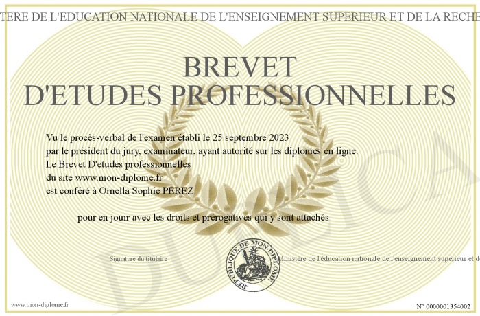 Envoyez par email votre Brevet D'etudes professionnelles personalisé