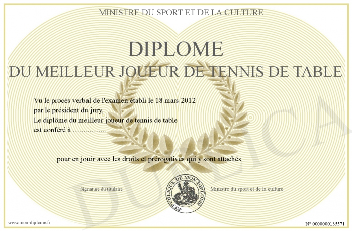 Envoyez par email votre Diplôme du meilleur joueur de Tennis de table personalisé