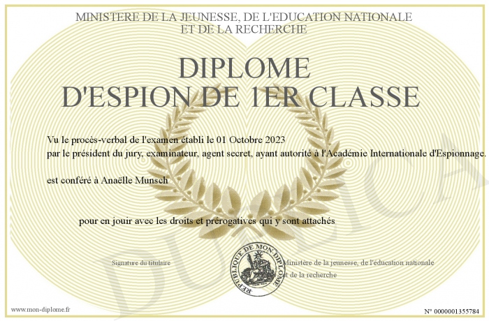 Envoyez par email votre Diplôme d'Espion de 1er Classe personalisé