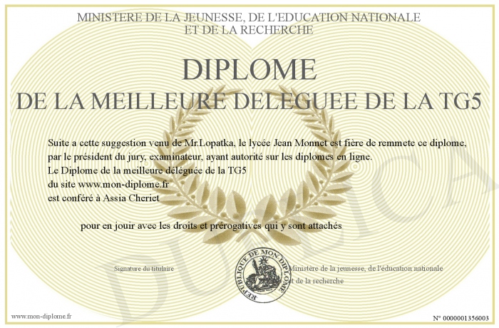 Envoyez par email votre Diplôme de la meilleure déléguée de la TG5 personalisé