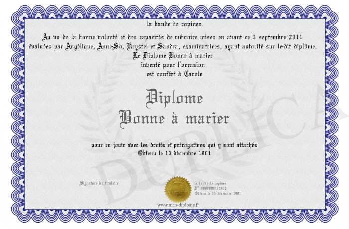 Envoyez par email votre Diplome Bonne à marier personalisé