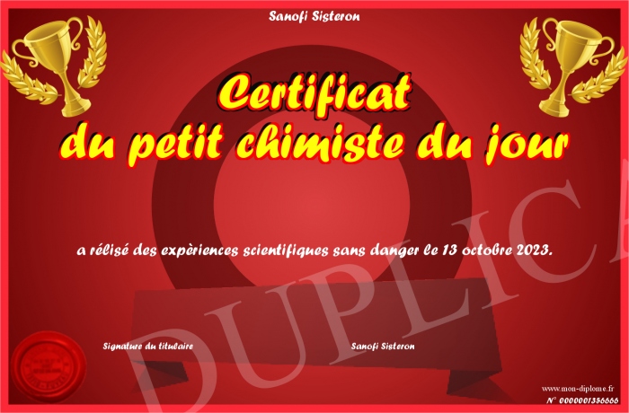 Envoyez par email votre Certificat du petit chimiste du jour personalisé