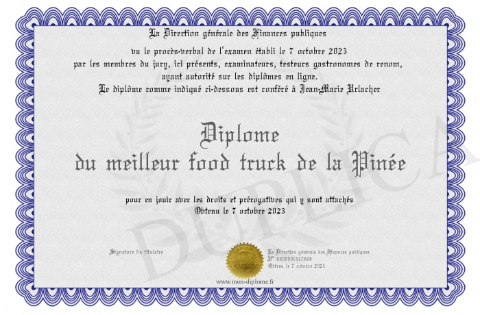 Envoyez par email votre Diplôme du meilleur food truck de la Pinée personalisé