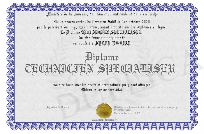 Envoyez par email votre Diplôme TECHNICIEN SPECIALISER personalisé