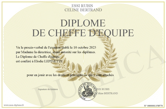 Envoyez par email votre Diplôme de Cheffe d'équipe personalisé