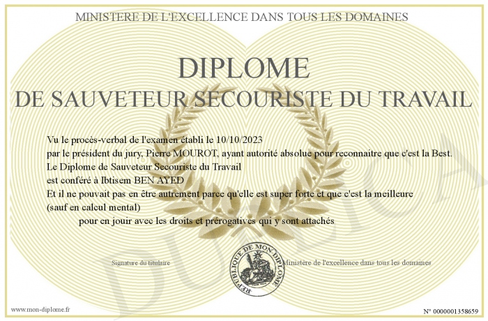 Envoyez par email votre Diplôme de Sauveteur Secouriste du Travail personalisé