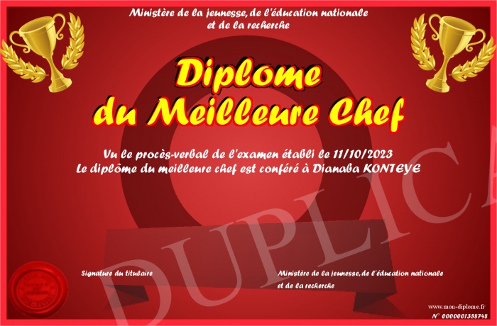 Envoyez par email votre Diplôme du Meilleure Chef personalisé