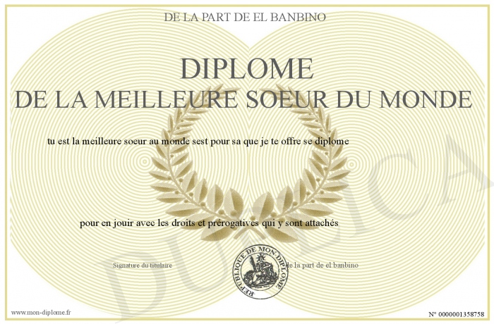 Envoyez par email votre diplome de la meilleure soeur du monde personalisé