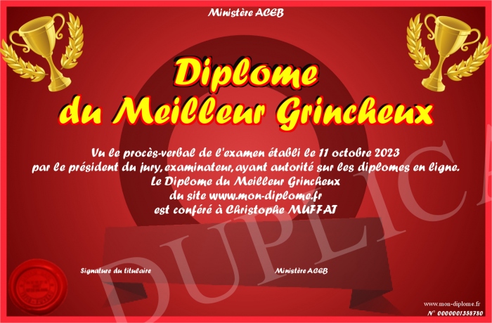 Envoyez par email votre Diplôme du Meilleur Grincheux personalisé