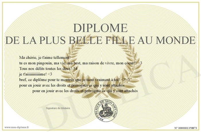 Envoyez par email votre Diplôme de la plus belle fille au monde personalisé
