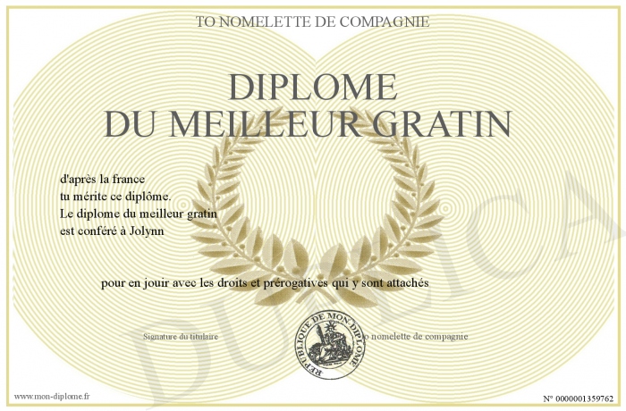 Envoyez par email votre diplôme du meilleur gratin personalisé