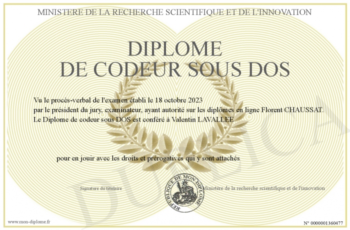 Envoyez par email votre Diplôme de codeur sous DOS personalisé
