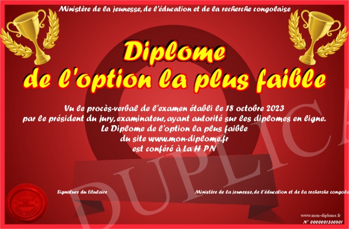 Envoyez par email votre Diplôme de l'option la plus faible personalisé