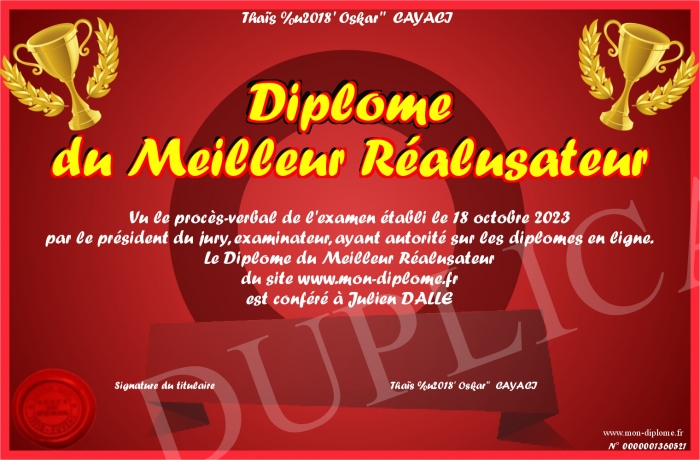 Envoyez par email votre Diplôme du Meilleur Réalusateur personalisé