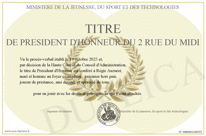 Envoyez par email votre TITRE de Président d'Honneur du 2 rue du Midi personalisé