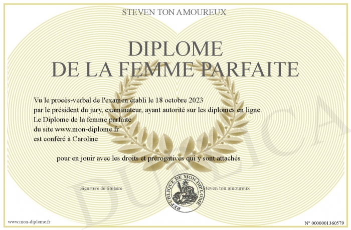Envoyez par email votre Diplôme de la femme parfaite personalisé