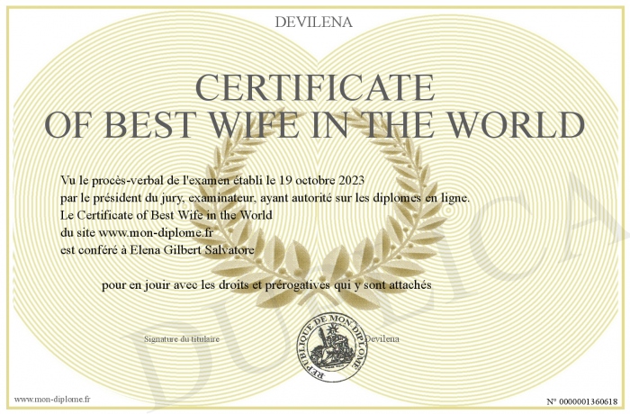 Envoyez par email votre Certificate of Best Wife in the World personalisé